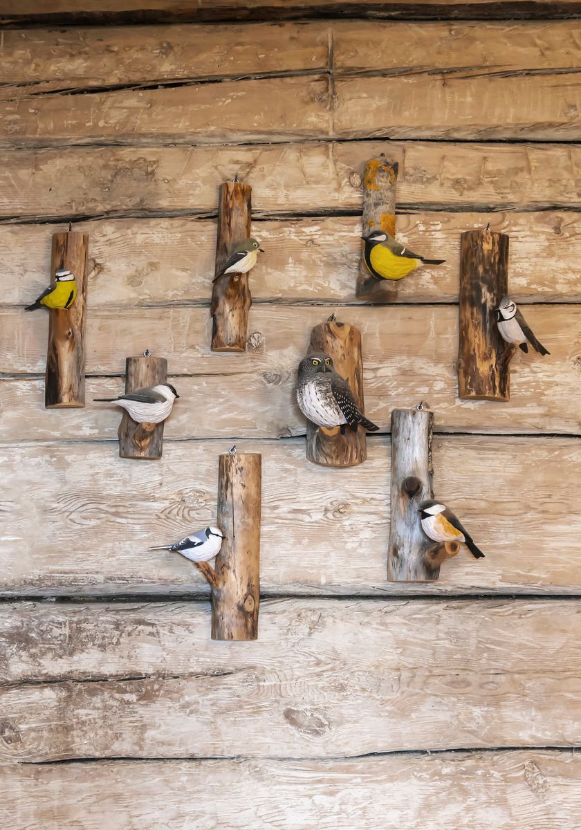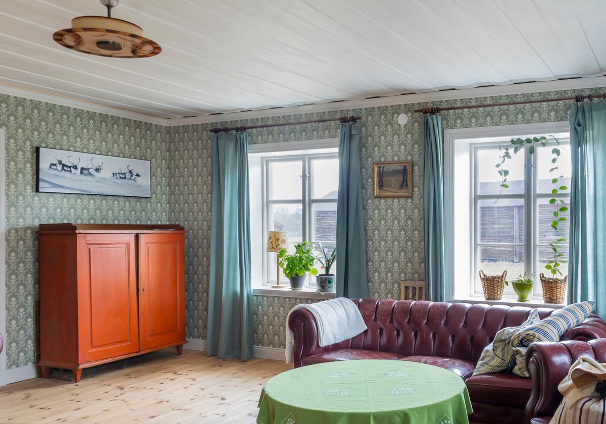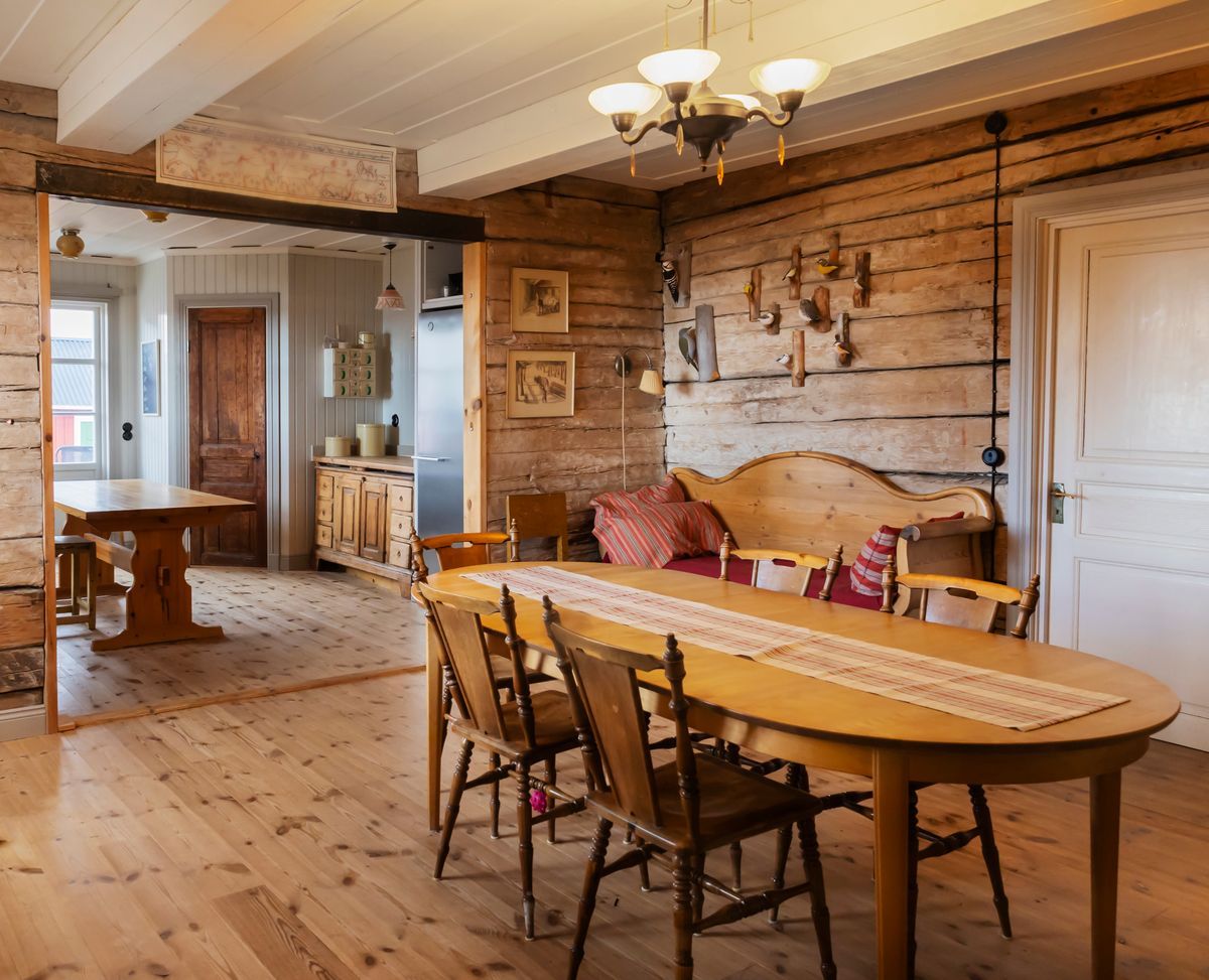 Ovanför kökssoffan hänger fåglar snidade i trä som Kjell Wågberg i Jokkmokk tillverkat. I rummet finns också flera tidstypiska, massiva skåp.