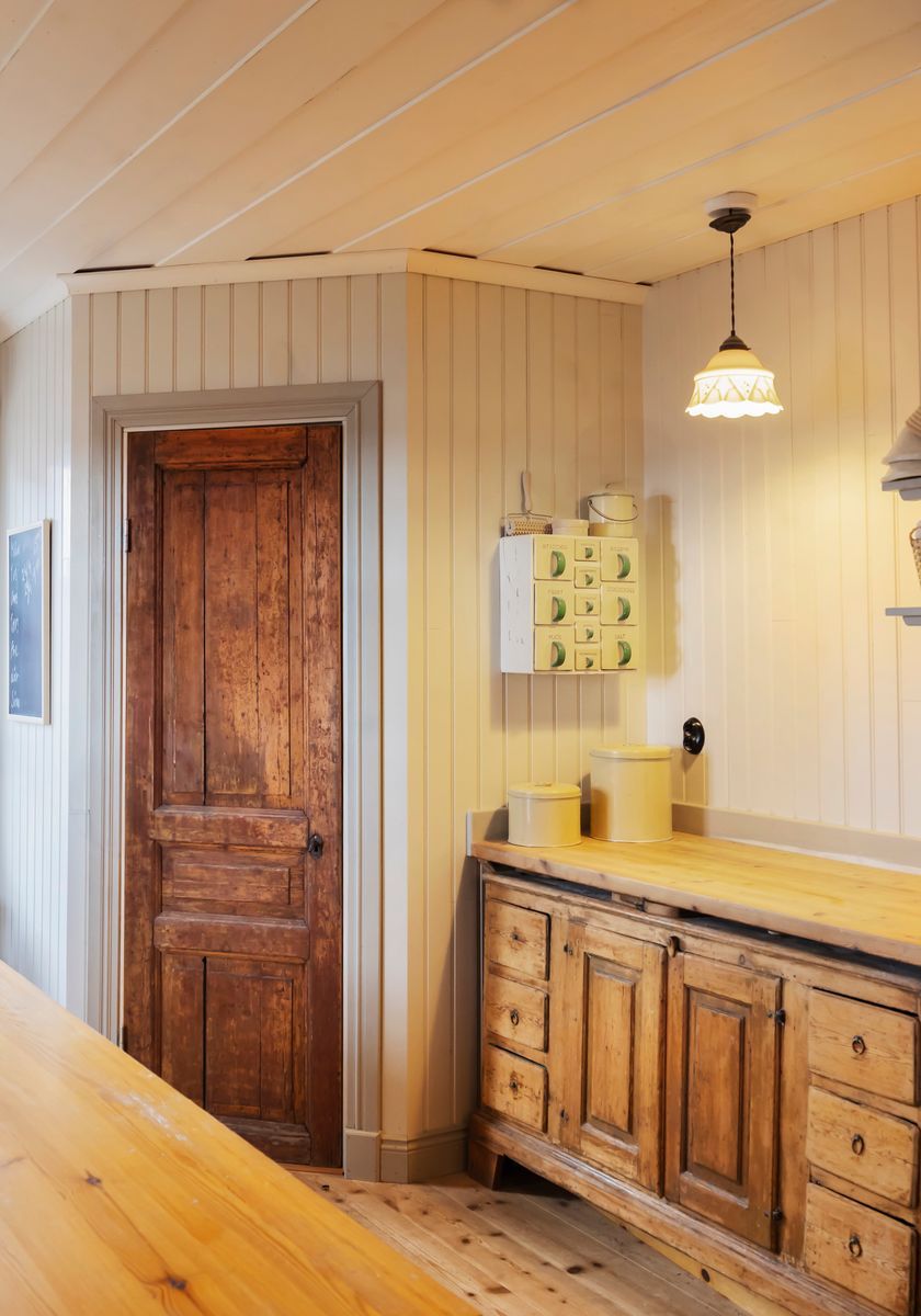 Även i köket har gamla 1800-tals skåp fått ersätta en modern köksinredning. Maten förvaras delvis i burkar och i olika fack märkta med mjöl, strösocker och salt som hänger på pärlsponten på väggen. Naturligtvis finns också ett gammaldags skafferi som man kan gå in i. Även i vardagsrummet finns ett stort skåp.
