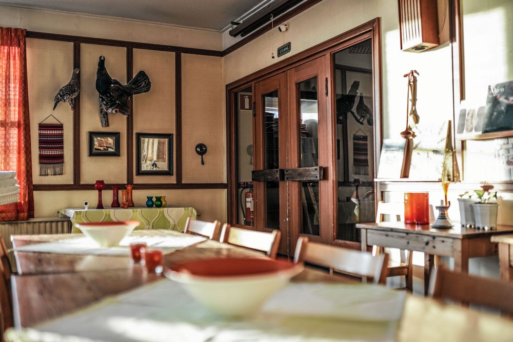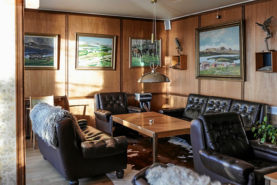 På väggarna hänger oljemålningar med Kolåsenmotiv jämte älghorn och en uppstoppad ripa, medan matsalen intill är prydd med 1970-talslampor i orange och dito gardiner.