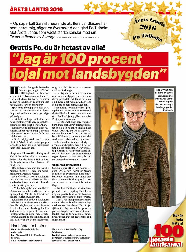 För ett år sedan utsåg tidningen Land tillsammans med er läsare journalisten Po Tidholm till Årets lantis 2016. Tidigare år har vi sett bland andra prinsessan Sofia, Kristina Lugn, Linda Lindorff och Timbuktu på samma lista. Gemensamt har de sitt stora engagemang för Landsbygdssverige.