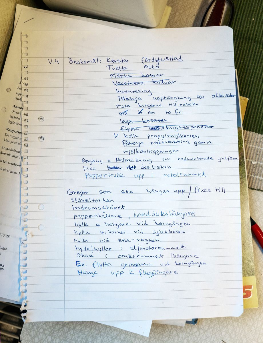 Dessutom har han fått en lång lista på vad som ska göras under veckan vi är där, det är allt från att mota kvigorna till roboten, börja montera ner den gamla mjölkanläggningen till att fixa till stöveltorken och hänga upp flugfångare.