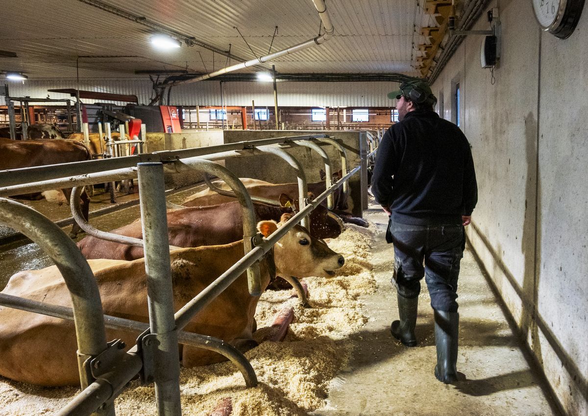 När vi träffar Klas har han varit igång sedan klockan sex på morgonen och gjort morgonpasset, fodrat, skrapat gödsel, lagt ut nytt spån, matat kalvarna.