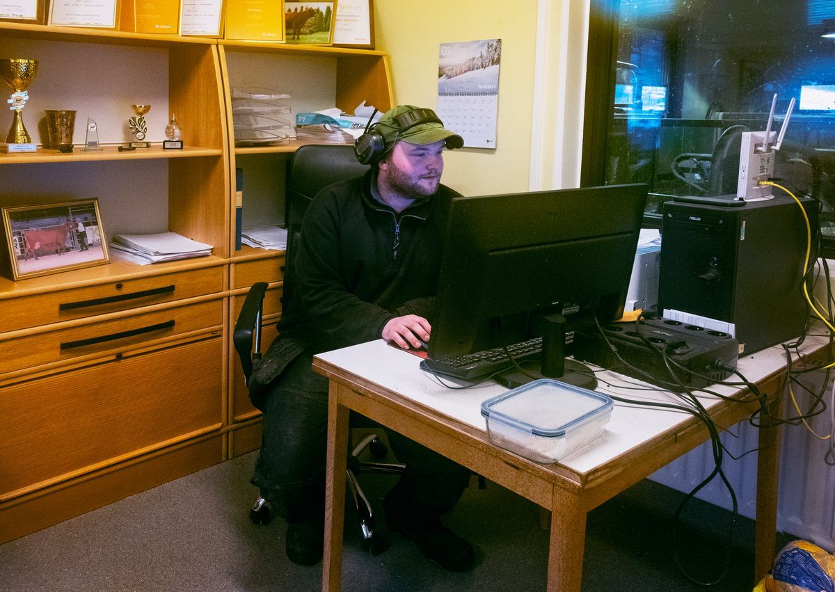 Klas bjuder på kaffe på kontoret. Vid datorn har han utsikt över korna, och i bokhyllan trängs utmärkelserna som moster Anneli fått för sin framgångsrika uppfödning av Jerseykor.
