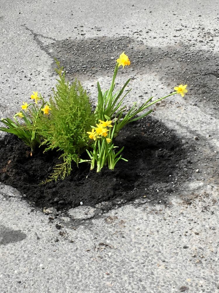 Trots påstötningar blev hålet aldrig lagat. Till slut tog en anonym person tag i saken och fyllde hålet med påskliljor.