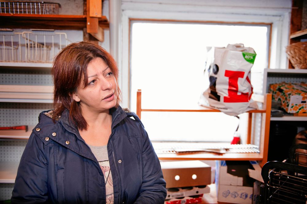 Hon står och småpratar med de nya ägarna Reim Ashihabe, 44 år, och hennes man Taisir Al Mohammed, 40 år, medan de packar ner hennes varor.