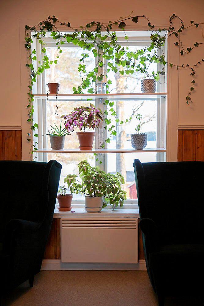 Där inne doftar det nybakad morotskaka. På väggarna hänger fotografier från den omgivande naturen, i fönstren står pelargoner, palettblad och andra krukväxter.