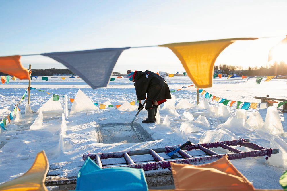 En annan stor gästmagnet är isvaken. Den finns bara några meter från Roots farstu och är ovanligt instagramvänlig, omringad av färgglada vimplar.