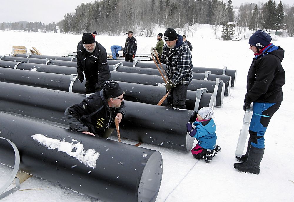 Byborna började med att tillsammans lägga ut patroner på isen nedanför Mårdsjöns badplats. På dem ska den 100 kvadratmeter stora flotten i sommar flyta.