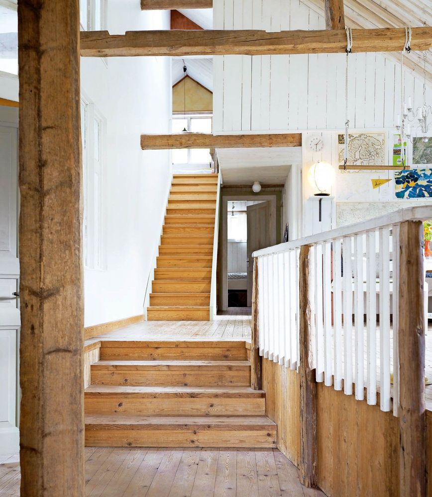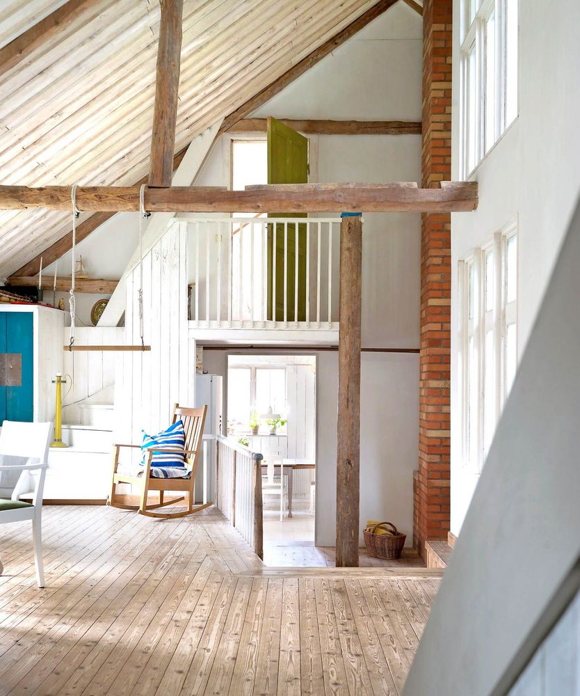Än i dag känner man ladans närvaro i de tjocka, huggna takbjälkarna och alla vackra träräcken som sätter prägel på rummet. Här är fullt av platsbyggda lösningar i form av soffor, bänkar, bokhyllor och skåp, ofta med egendesignade handtag av läder eller järn. Det omålade plankgolvet, som Kenneth räddade från ett rivet snickeri, ger intrycket av att ha legat här sedan huset byggdes.