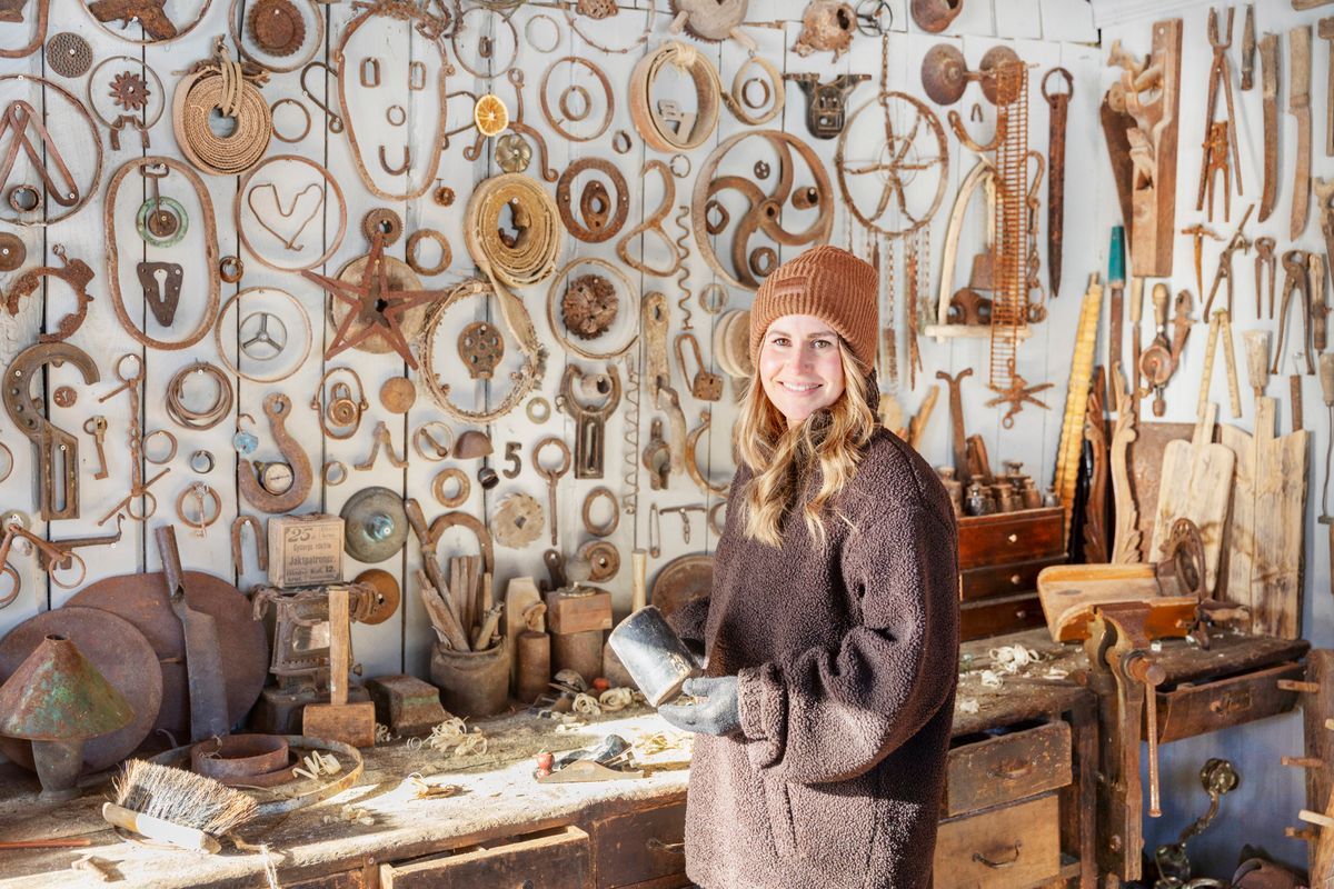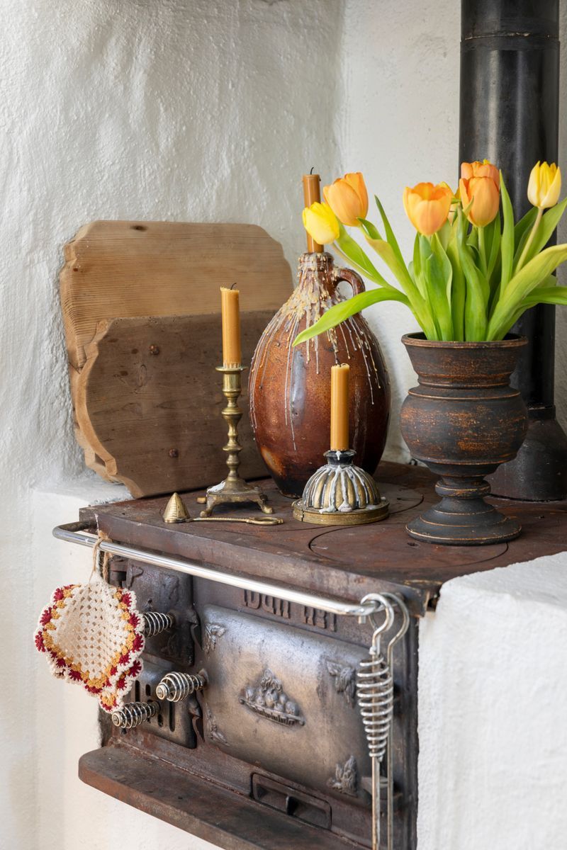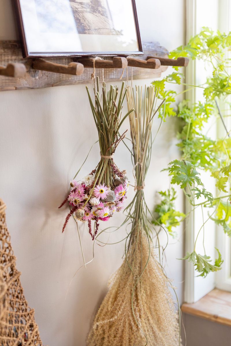 Det sprakar och värmer från brasan i kaminen. På de hemsnickrade knoppbrädorna hänger buketter med glänsande eterneller och torkad renfana, odlade och vildplockade av Emma Qvist Kocian i somras.