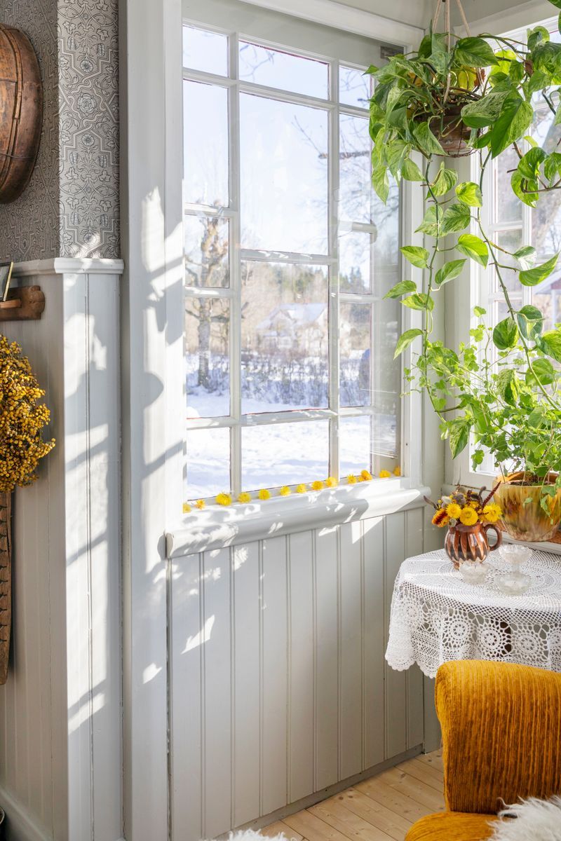 Vintersolen skiner in genom glasverandans spröjsade fönster och innanfönstren som Emma tillverkat på egen hand. Samma sak med det såpskurade brädgolvet, de höga golvsocklarna och de penselmålade köksluckorna och pärlsponten – alltsammans är Emmas verk.