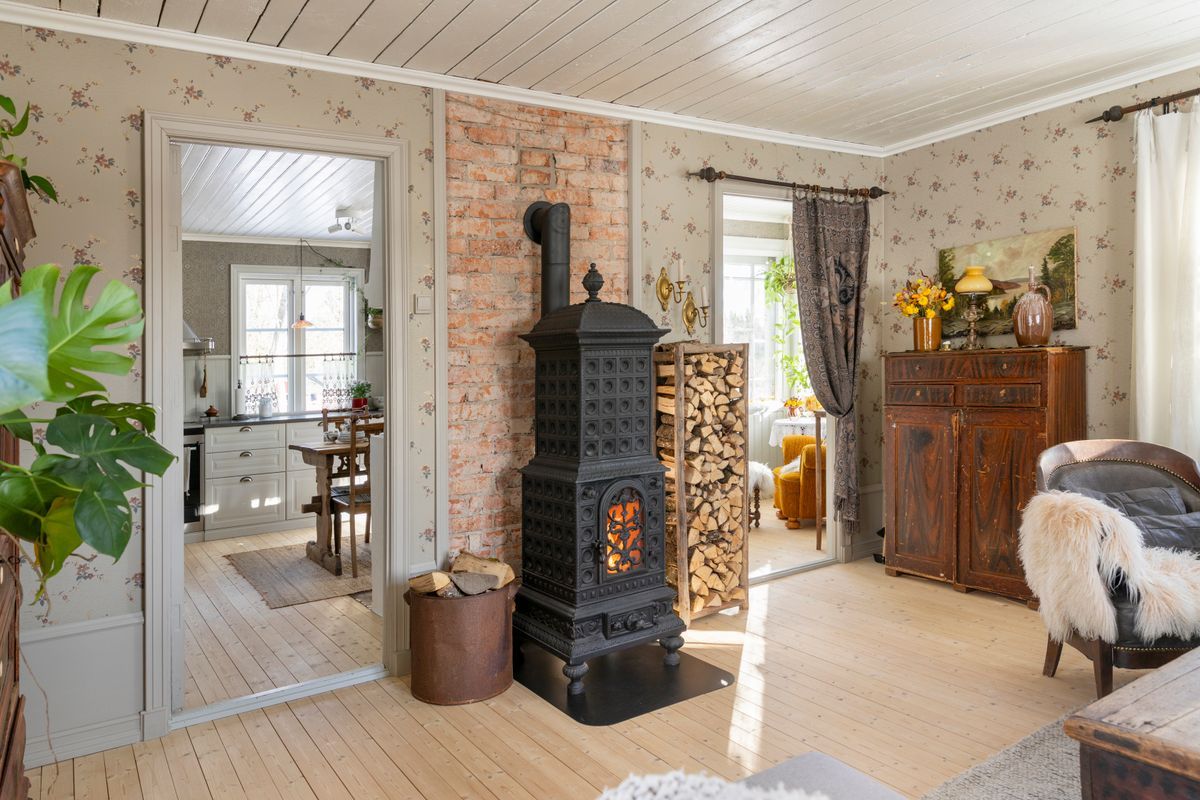 När flyttlasset gick i augusti fanns nästan allt på plats invändigt: Kök, badrum, två nya eldstäder, barnrum och isolerade golv. Hon hade också öppnat upp mellan det tidigare så trånga köket och glasverandan.