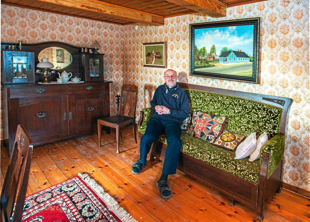 – Men det isolerades och gjordes om till min systers bröllop i slutet på sjuttiotalet och har sedan varit gårdens finrum, säger Stefan och sätter sig ner i den gamla släktsoffan.