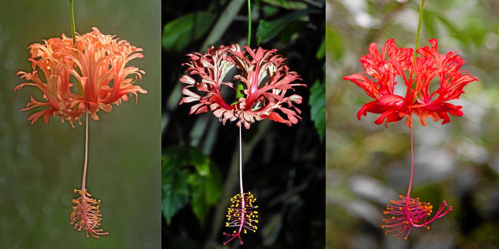 När en fjäderhibiskus (Hibiscus schizopetalus) blommar är den naturliga instinkten att häpet dra efter andan. Blomman kallas ofta för japansk lykta eftersom den hänger under de smala grenarna som en papperslykta, de fransiga röda bladen är själva lyktan medan ståndare och pistiller dinglar underst som en lång tofs.