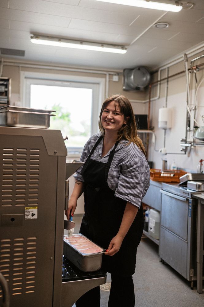 Amalia är den som mestadels sköter glassmaskinen och tycker det är jättekul att experimentera med nya smaker.
