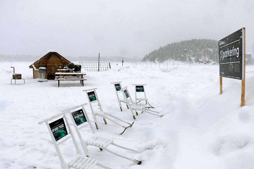 I fjol köpte Lycksele turistbyrå in ett par sparkar, men i år blev det ett helt dussin. De målades vita med medar i guldfärg och försågs med bilder på norrsken.
