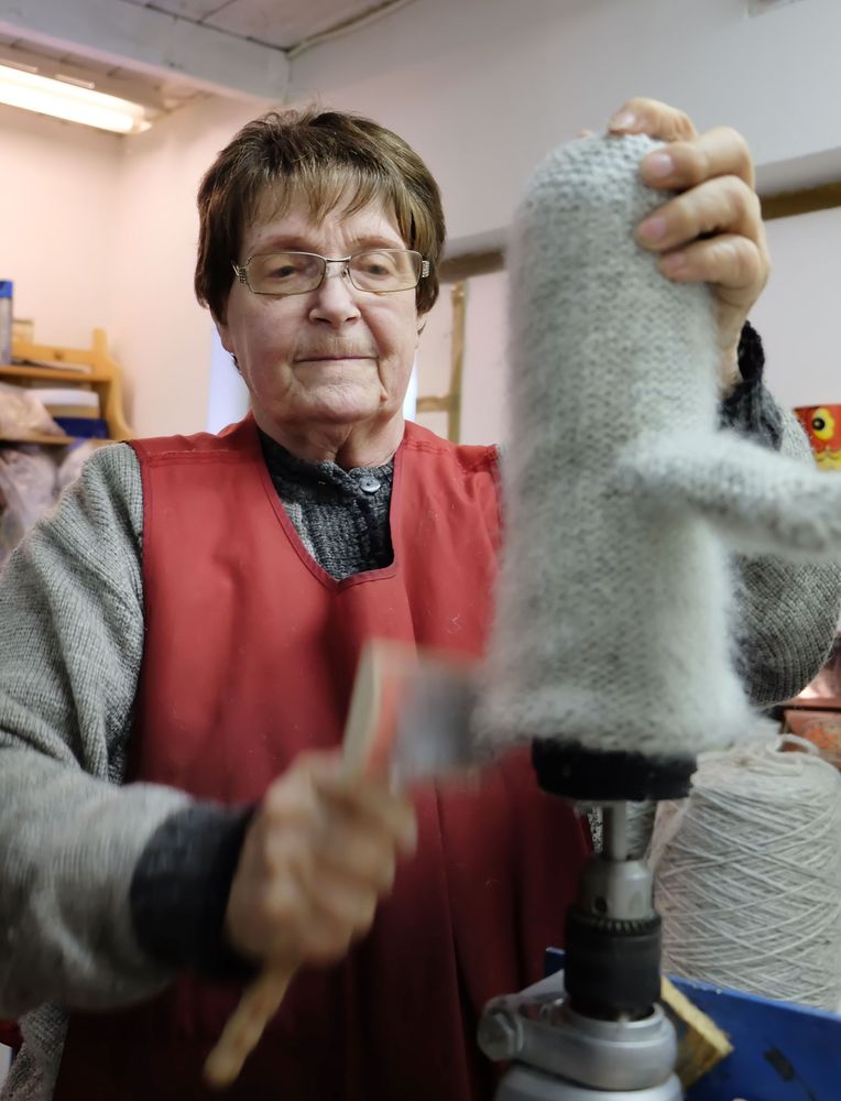 En del av vanten sticker hon med en gammal handstickmaskin, men alla muddar gör hon helt för hand på fyra stickor. Sedan tvättar hon vantarna och ruggar upp ullgarnet i en specialmaskin som Gunvors man byggt av en borrmaskin.