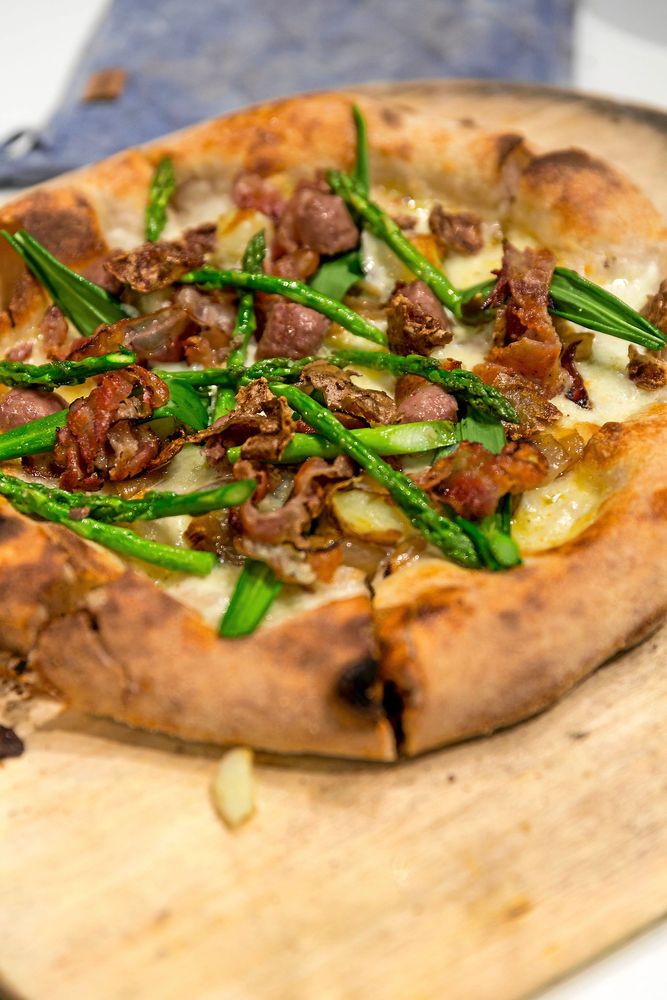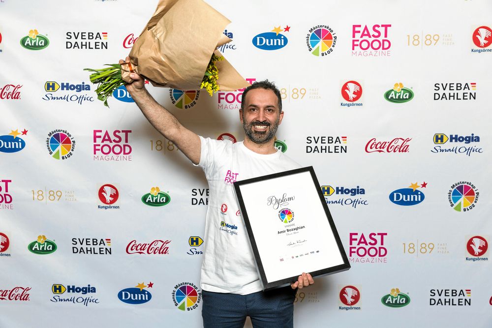 Amir Bozaghians vinnarpizza har namnet "l´Estate", som betyder sommar på italienska, och innehåller förutom ramslök och rökt sidfläsk även lammkorv, sparris, potatis, mozzarella, citronkräm och krasse.