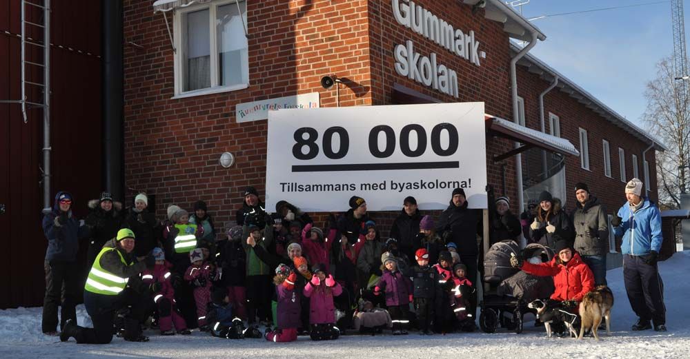 Därför har föräldrarna även åkt runt och fotat andra byskolor med en skylt med texten: "80 000 tillsammans med byaskolorna".