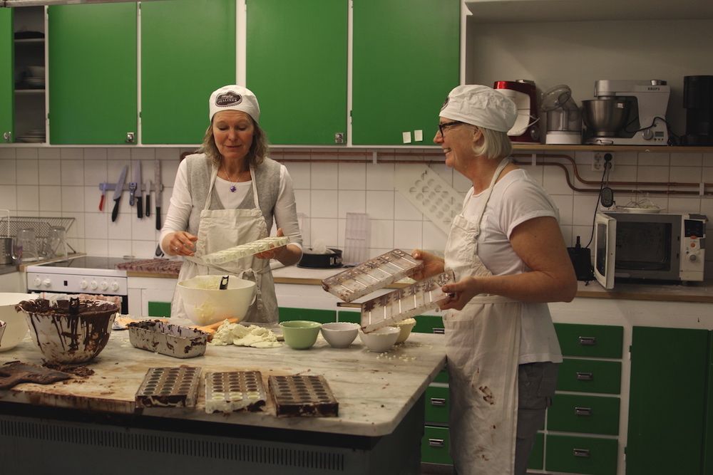 Det puttrar och sjuder i en lokal vid gamla Stripa gruva i Guldsmedshyttan. En mäktig och söt doft av choklad sprider sig. De två vännerna Ywonne Lindberg och Gunilla Borensjö fyller formar med trögflytande chokladsmet.