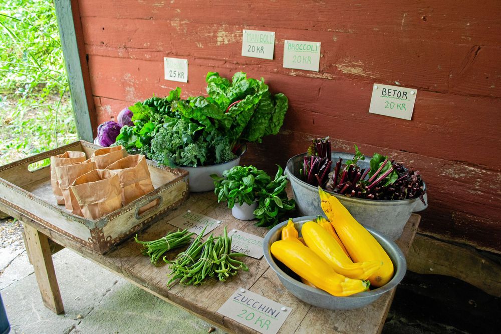 I det lilla portskjulet säljs överskottsgrönsakerna från husbehovsodlingen.