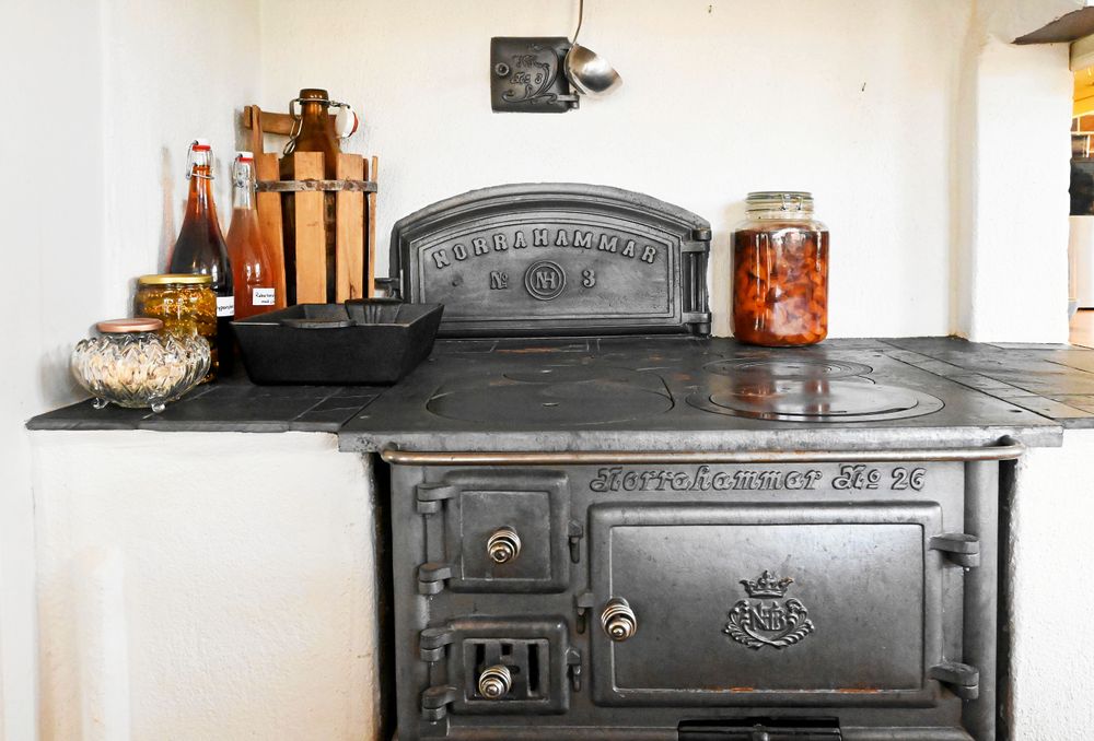 Inne köket, på den gamla järnspisen står en romtopf, frukt och bär i sprit och sockerlag.