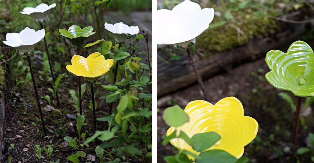 Vackra keramikblommor att sticka ned i rabatten.