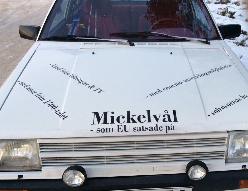 Själv kör han omkring i en bil full med dekaler med "mer eller mindre sanna" påståenden om Mickelvål, berättar Leif. Bland annat "solrosornas paradis", "känd från tidningar & tv", "med anor från 1500-talet" och "tiomilautsikt".