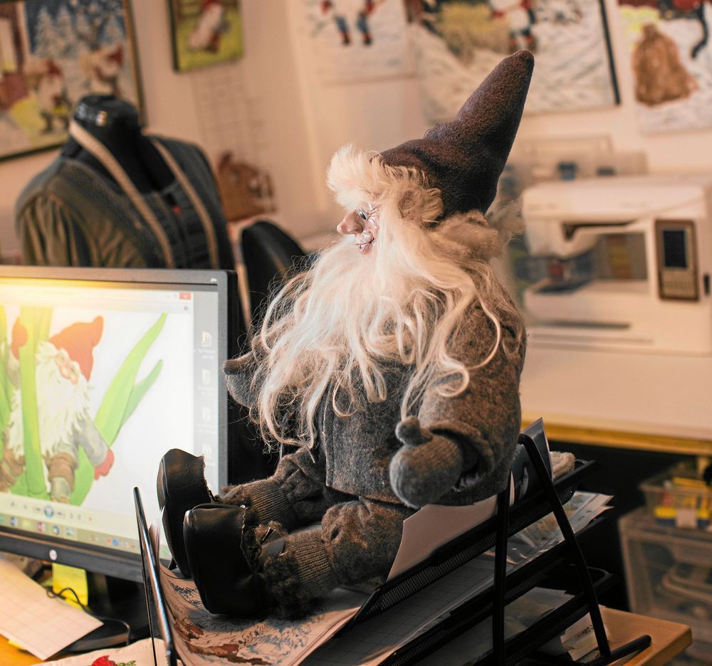 Man kan knappt gå in i en butik utan att möta Kerstins kluriga tomtar – på etiketter, julklappspåsar, julkort och papptallrikar.