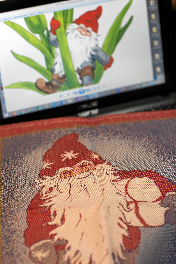 Hon är väldigt kreativ och målar inte bara tomtar som trycks på papper, utan skapar även motiv och mönster för dukar, gobelänger, gardiner och handdukar.
