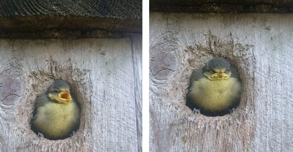 Den lilla blåmesen växte sig starkare för varje dag och fick allt mer tillit till sina "fosterföräldrar". Satte sig på deras axlar, pep och pickade på dem om de inte fixade mat snart nog.