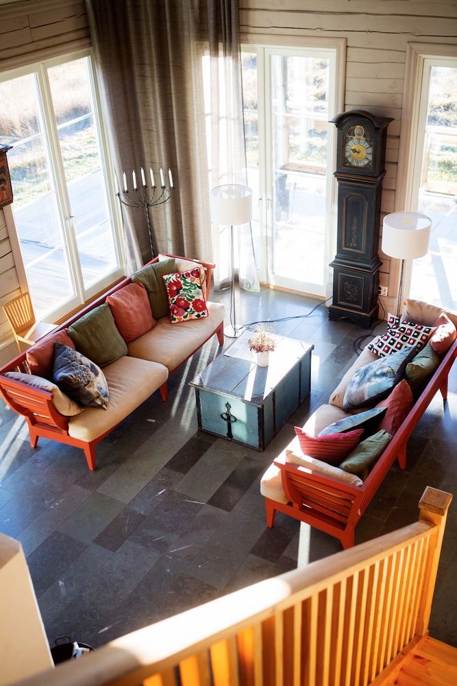 Men det är lugnet som uppskattas mest av besökarna. Från storstugans panoramafönster har man utsikt över ägorna och kan njuta av en god bok i någon sofforna till ljudet av brasans sprakande. Cecilia har inrett alla husen med en smakfull blandning av antika möbler, arvegods och loppisfynd.