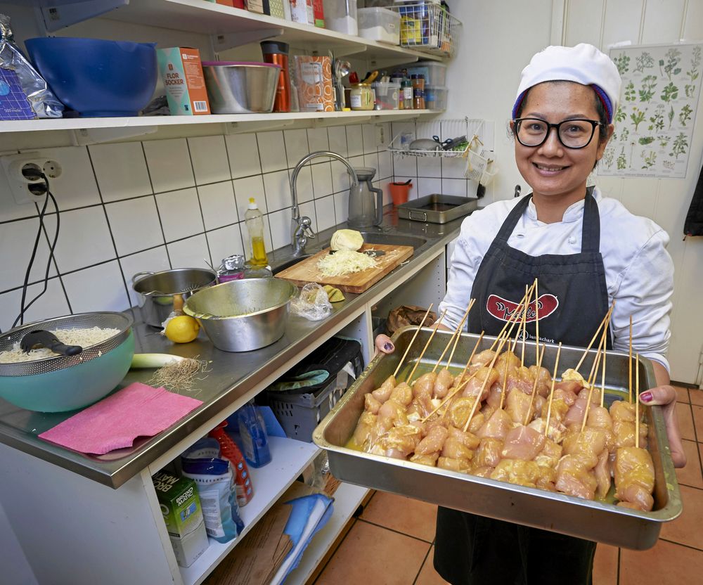 När vi öppnar dörren letar sig aptitretande dofter ut från butikens kök där Kea Nitjaphod står och lagar mat av råvaror som annars skulle förfaras.