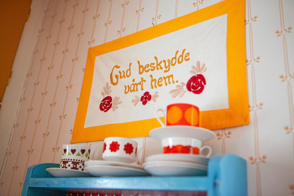 Som bonaden som hänger på köksväggen med den broderade texten ”Gud beskydde vårt hem”. Den började Lindas farmor brodera, men hann aldrig klart.
