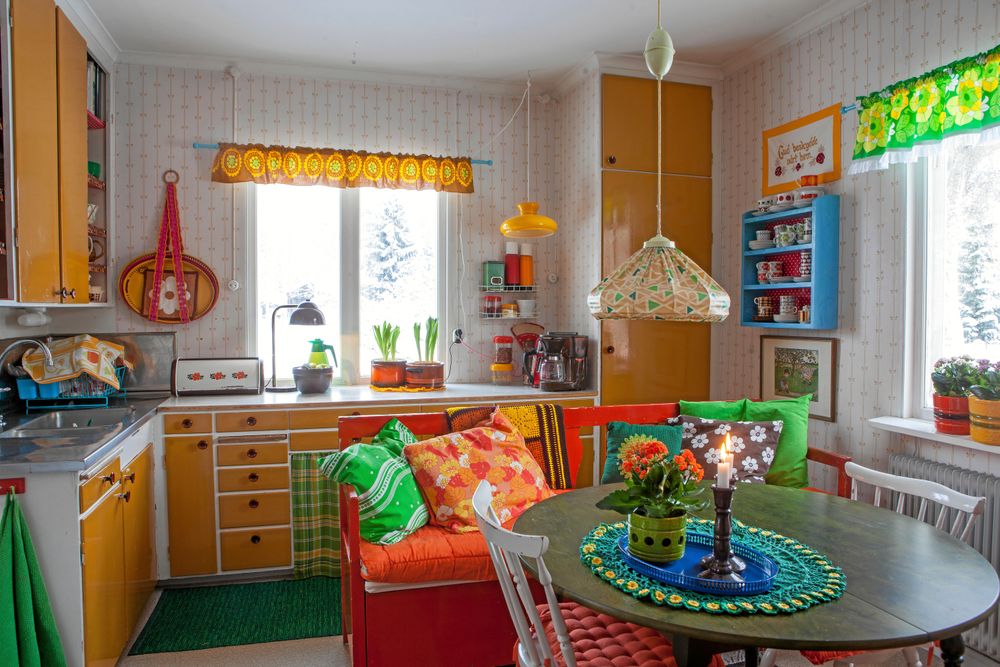Det fullkomligen spritter av glada färger överallt. Rödrandiga trasmattor, solgula köksskåp, grönblommiga gardiner och stormönstrade tapeter.