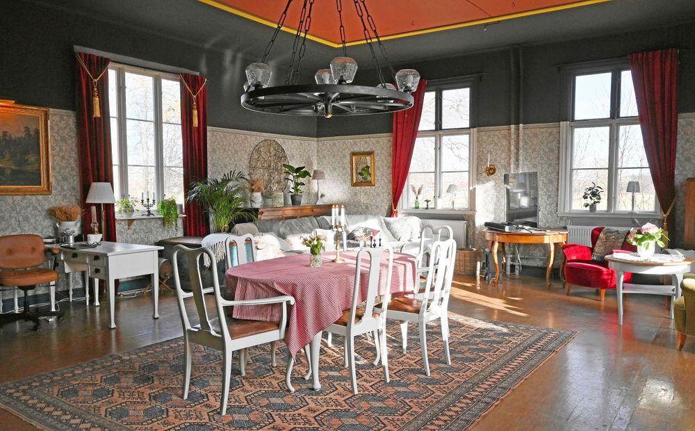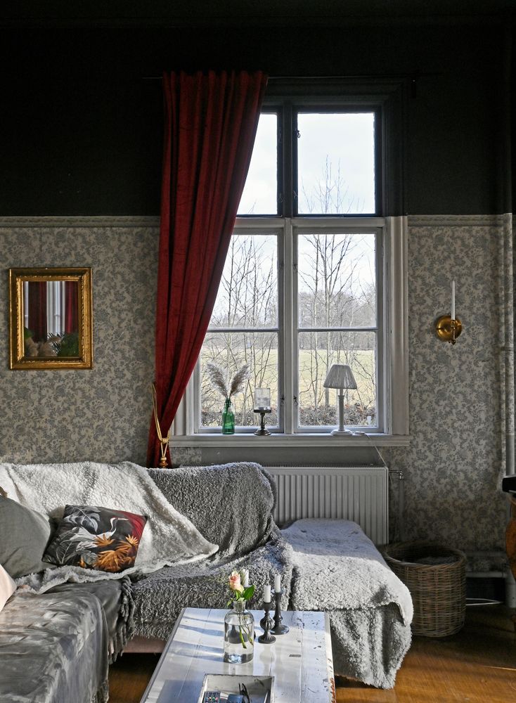 I flera av rummen på entréplanet har en tidigare ägare målat taket och övre delen av väggarna i svart färg för att ”sänka” taket och få en mer ombonad känsla.