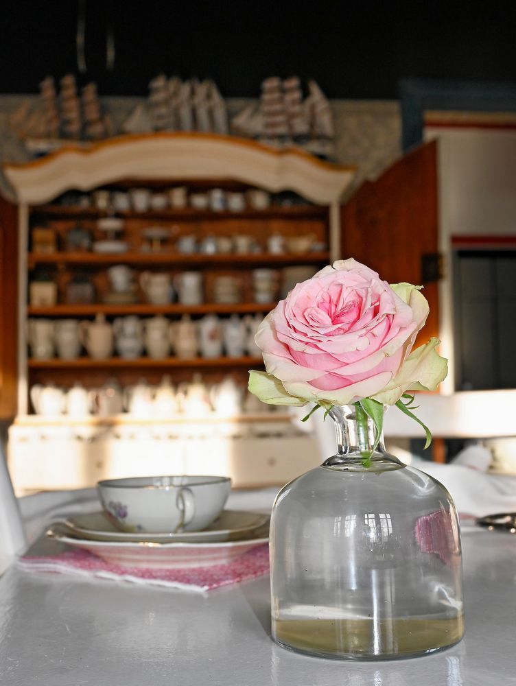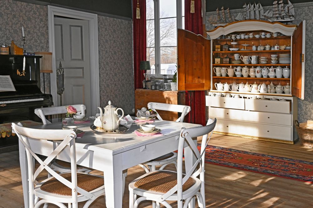 Bredvid den antika kassaapparaten står en cylinderhatt och ett bord är dukat med en kaffeservis i tunnaste porslin.
