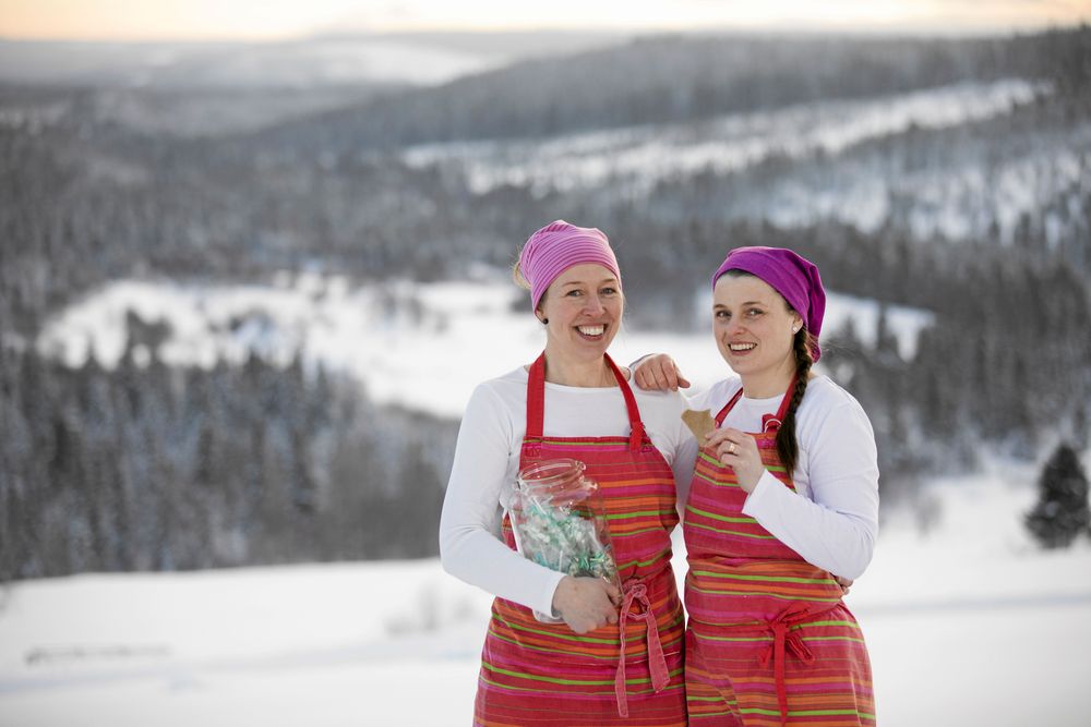 Ulrika Sundin och Madeleine Nilsson öppnar dörren till bygdegården där det doftar sött och aromatiskt från karamelltillverkningen i köket.