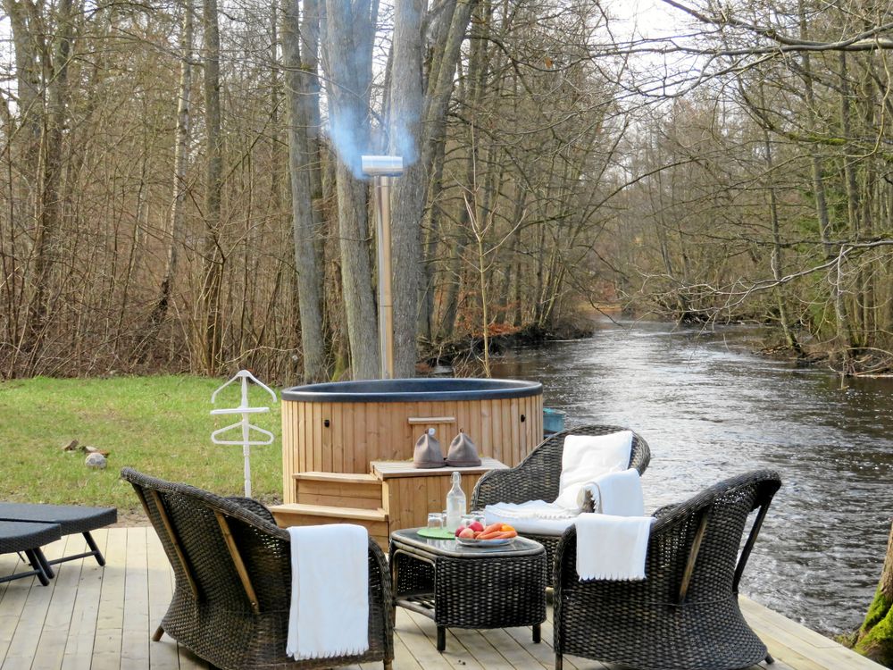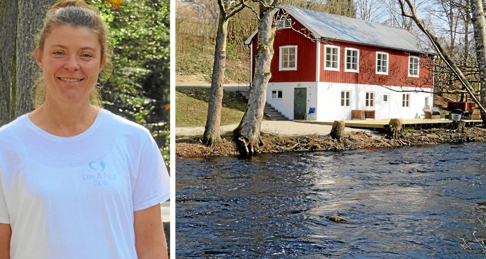Solen glittrar i vattenytan på Holjeåns som brusar fram precis intill Martinas nyligen invigda Lev & Njut Spa.