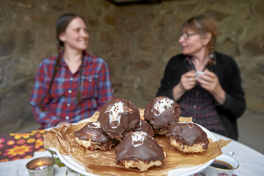 Lill-Stina står i köket där hon bakar allt bröd och alla kakor från grunden och brer mackor med gårdens ostar och en annan specialitet som pålägg – stekta vaktelägg.