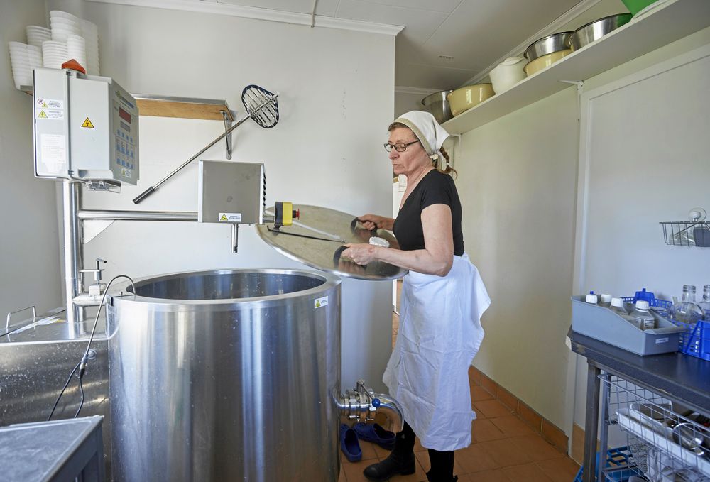 I dag står mamma Annelie i mejeriet och ystar ostmassa, som ska bli olika delikatessostar – två sorters blåmögelost, tre varianter av salladsostar och färskost.