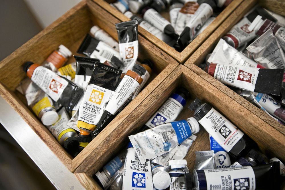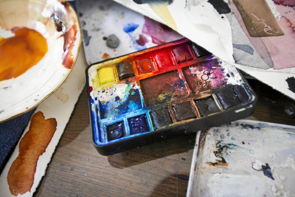 Hon doppar penseln i vattenglaset och låter akvarellfärgerna flyga.