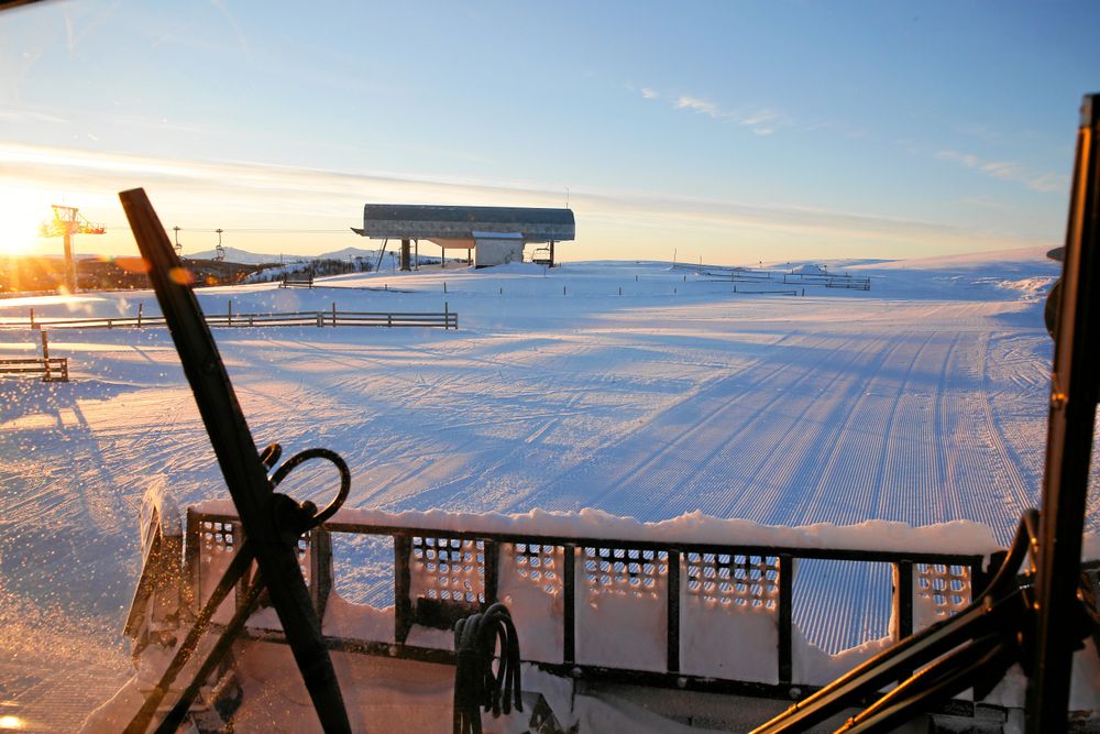 – En otrolig skillnad, säger Chrille som redan varit i farten i flera timmar när Lands reporter kliver in i hytten. Solen håller precis på att bryta igenom horisonten och temperaturskillnaden mellan utomhusluften och förarhytten är påtaglig. Inne i pistmaskinen är det lika bekvämt som i vilken bil som helst. Bortsett från lutningen (det lutar rätt rejält på sina ställen när Chrille skapar backens struktur).