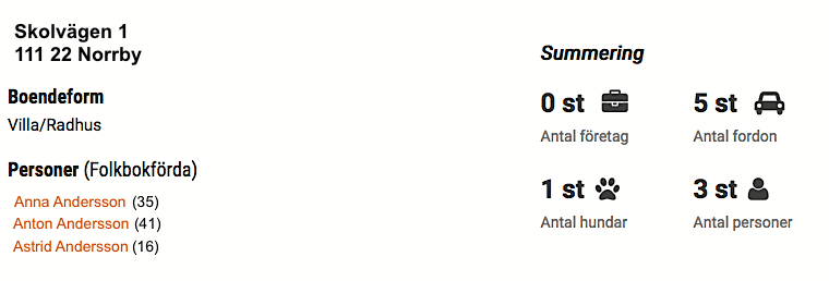 "Anna Andersson bor i en villa/radhus på Skolvägen 1 i postorten Norrby i Norrby kommun. Området där Anna bor tillhör Norrby församling. På adressen Skolvägen 1 finns 3 personer folkbokförda, Anna Andersson (35 år), Anton Andersson (41) och Astrid Andersson (16 år). På Annas adress finns 2 privatägda personbilar registrerade, AUDI årsmodell 2000 och FORD årsmodell 2010. Det finns även en hund på denna adress, en 13 årig Bostonterrier."