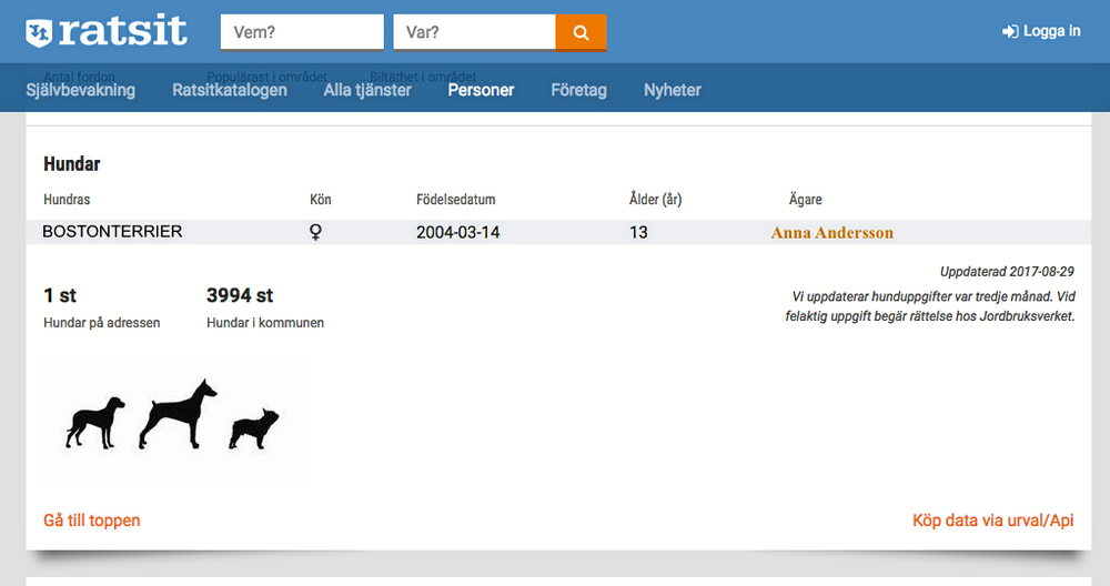Så här går det till. Den som vill veta vilka hundar som finns i ditt hus söker på ditt namn och bostadsort på Ratsit, någon inloggning eller betalning för extra information behövs inte.
