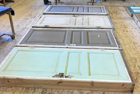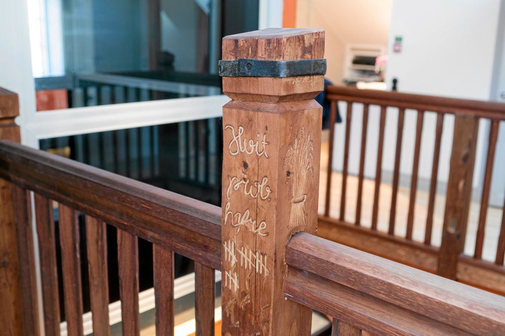 I stora salen har en gammal timmervägg plockats ner för att sedan byggas upp igen några meter bort för att öka antalet kvadratmeter. Gamla spegeldörrar som slipats och fått ny färg trivs i sällskap med vikbara glasväggar.