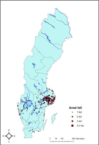 Se karta över riskområden här, de röda prickarna visar var i Sverige TBE-fallen smittades under 2016.