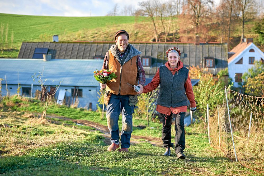 Lands utsända träffar dem mitt i vardagens sysslor. Gustav med leriga byxben efter trädgårdsjobb och Marie i värmande arbetskläder.
