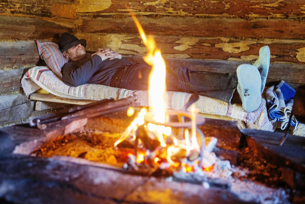 Men redan i februari, när ljuset kommer tillbaka, vaknar fäboden till liv. Då ska veden huggas, 50 kubik som dras hem med häst, kapas och klyvs.
