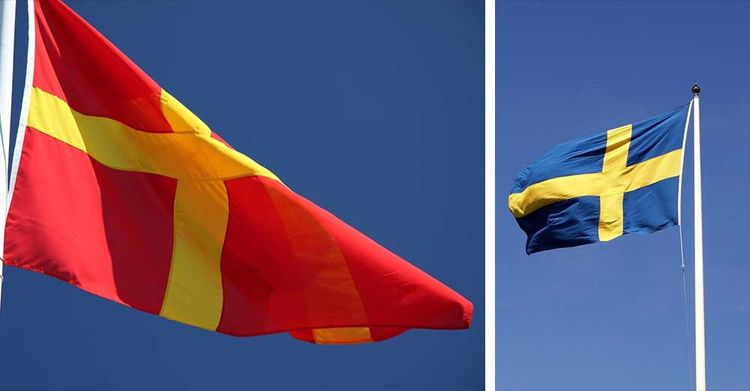 Den skånska flaggan med röd bakgrund och gult kors får inte hänga tillsammans med den svenska flaggan. Det slår flaggexperten Carl Michael Raab fast i samband med en förfråga från Region Skåne.